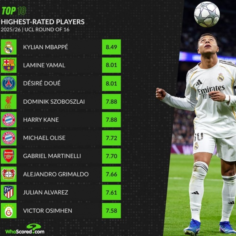KAIYUN SPORTS-本赛季欧冠16强球员场均评分榜:姆巴佩居首,亚马尔、杜埃前三